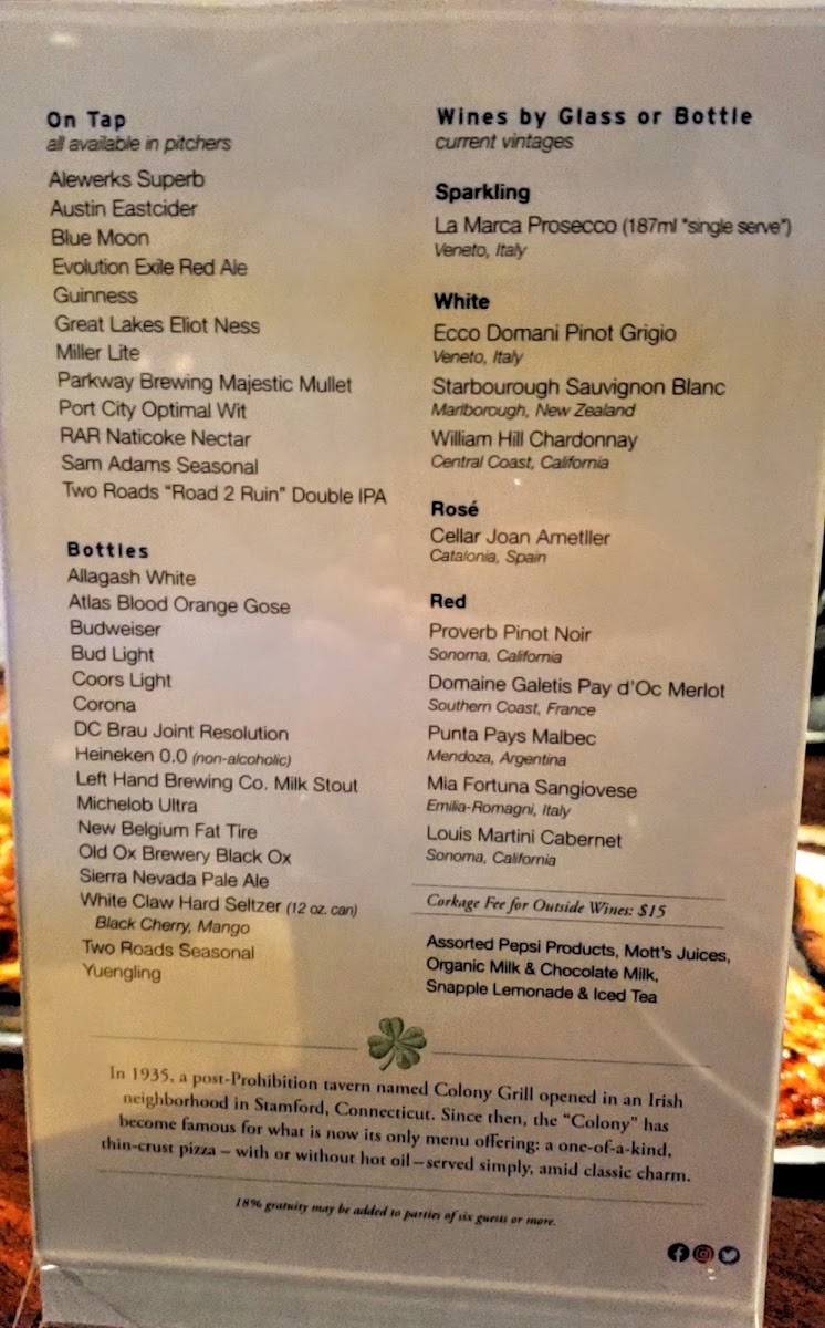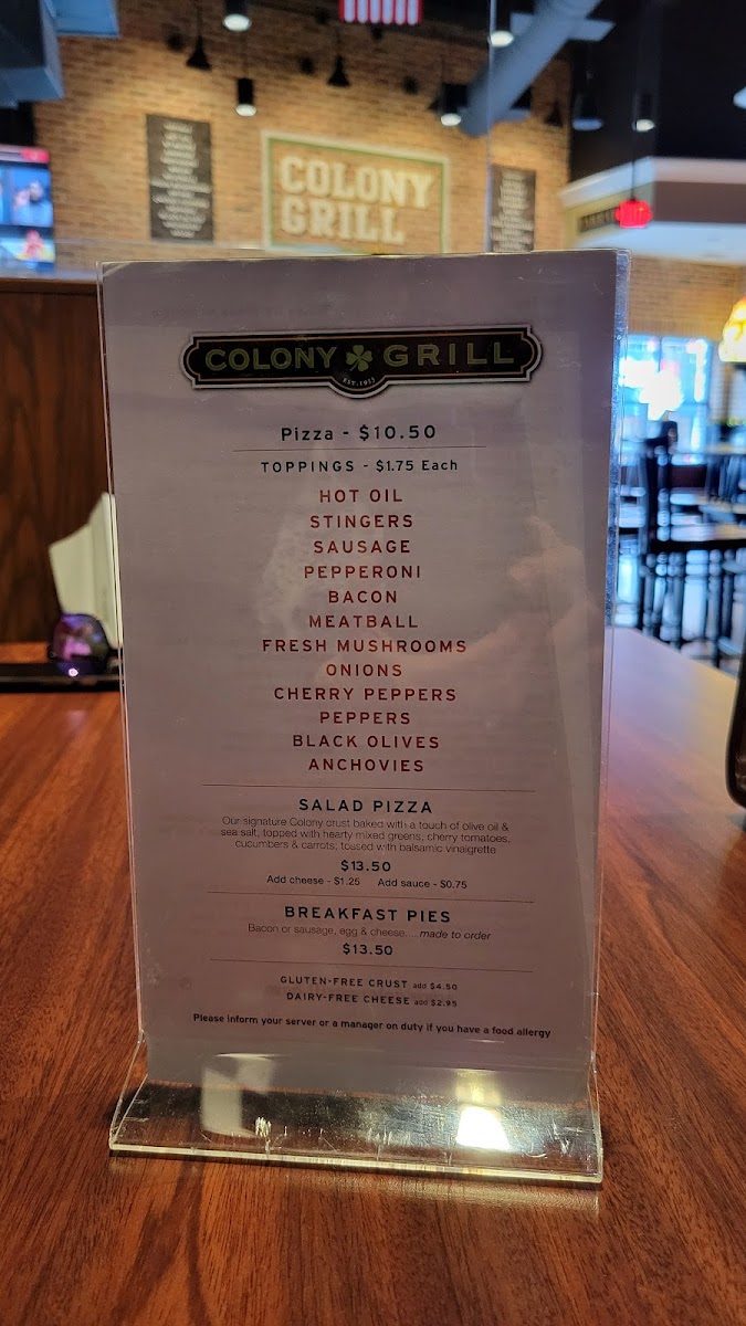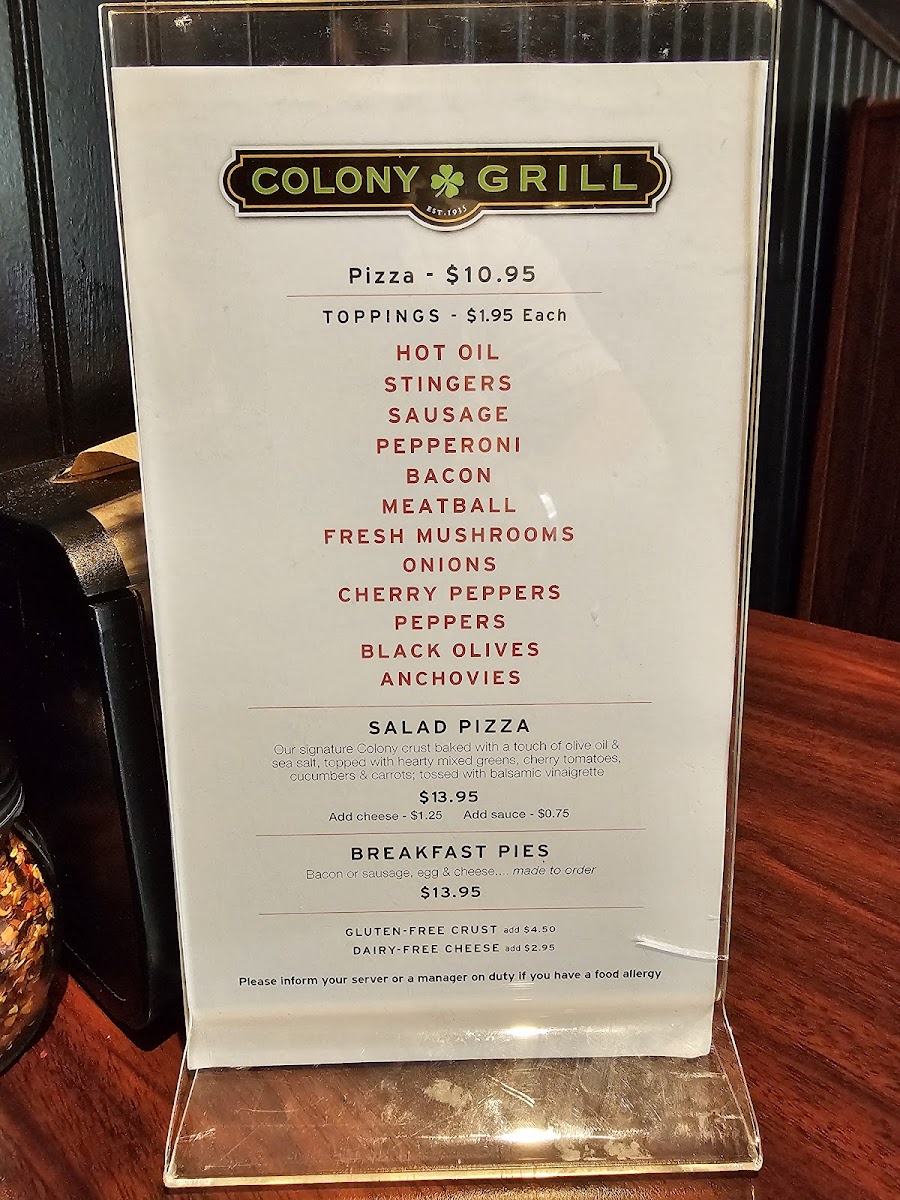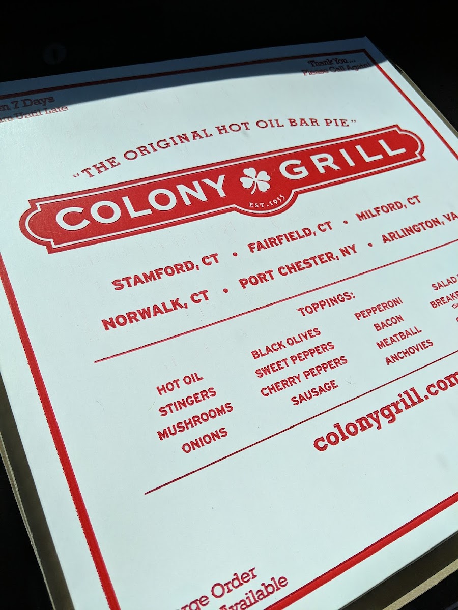 Welcome to Colony Grill, a delightful culinary gem nestled in the heart of Arlington, VA, at 2800 Clarendon Blvd. If you are on the hunt for a pizza experience unlike any other, you've come to the right place.