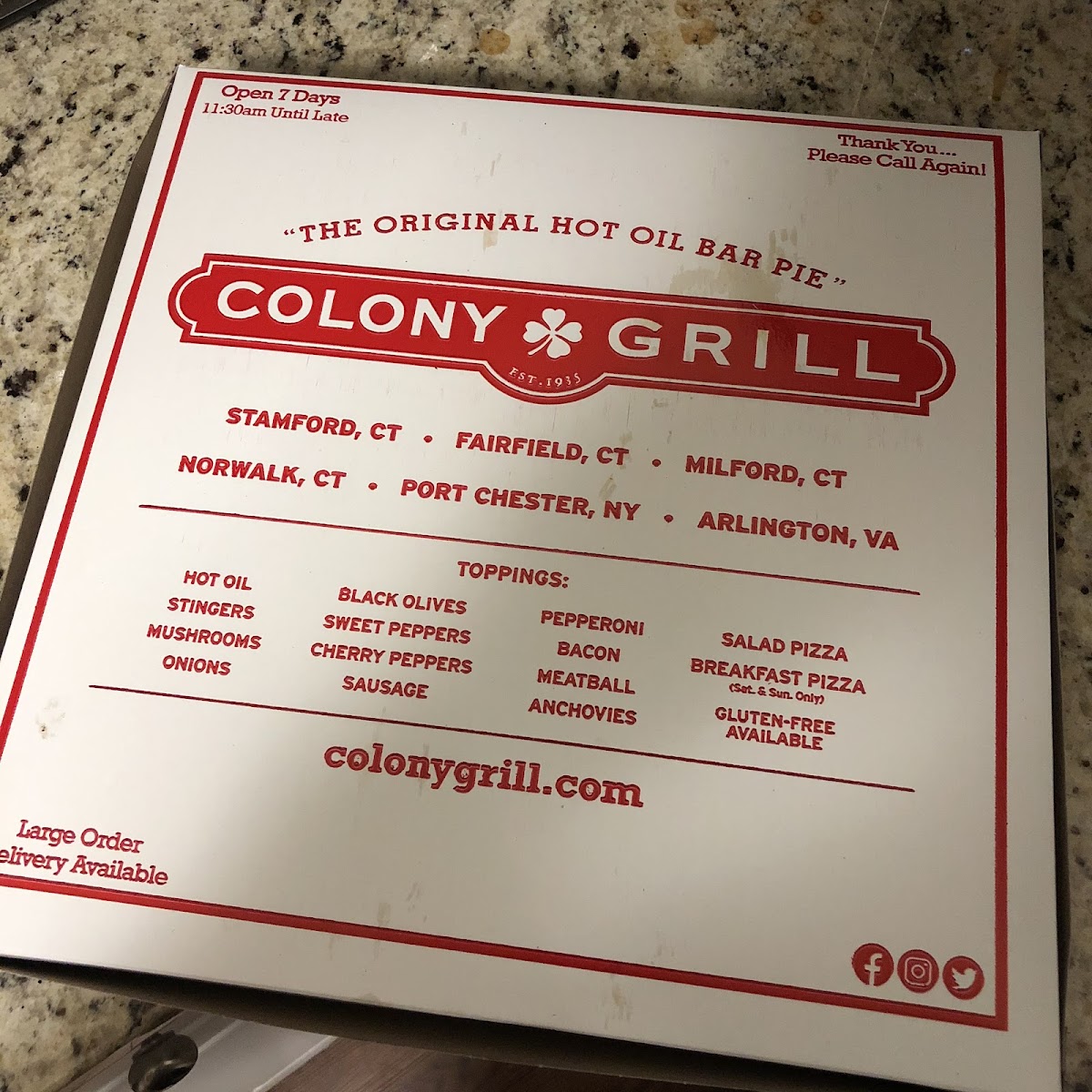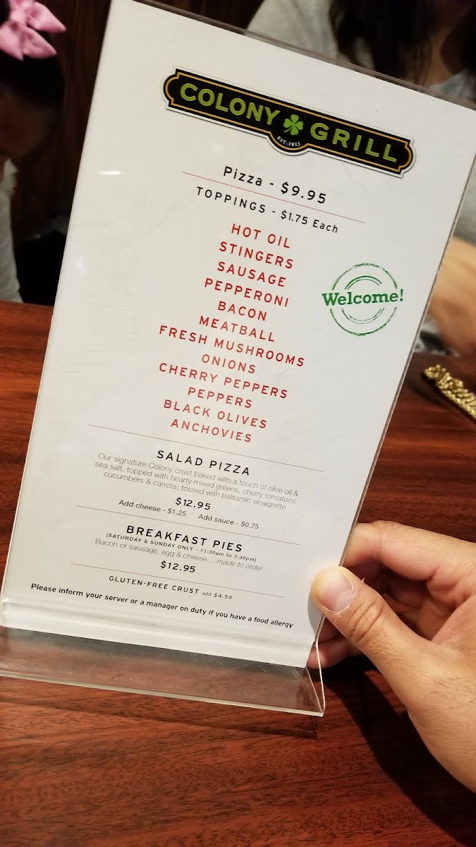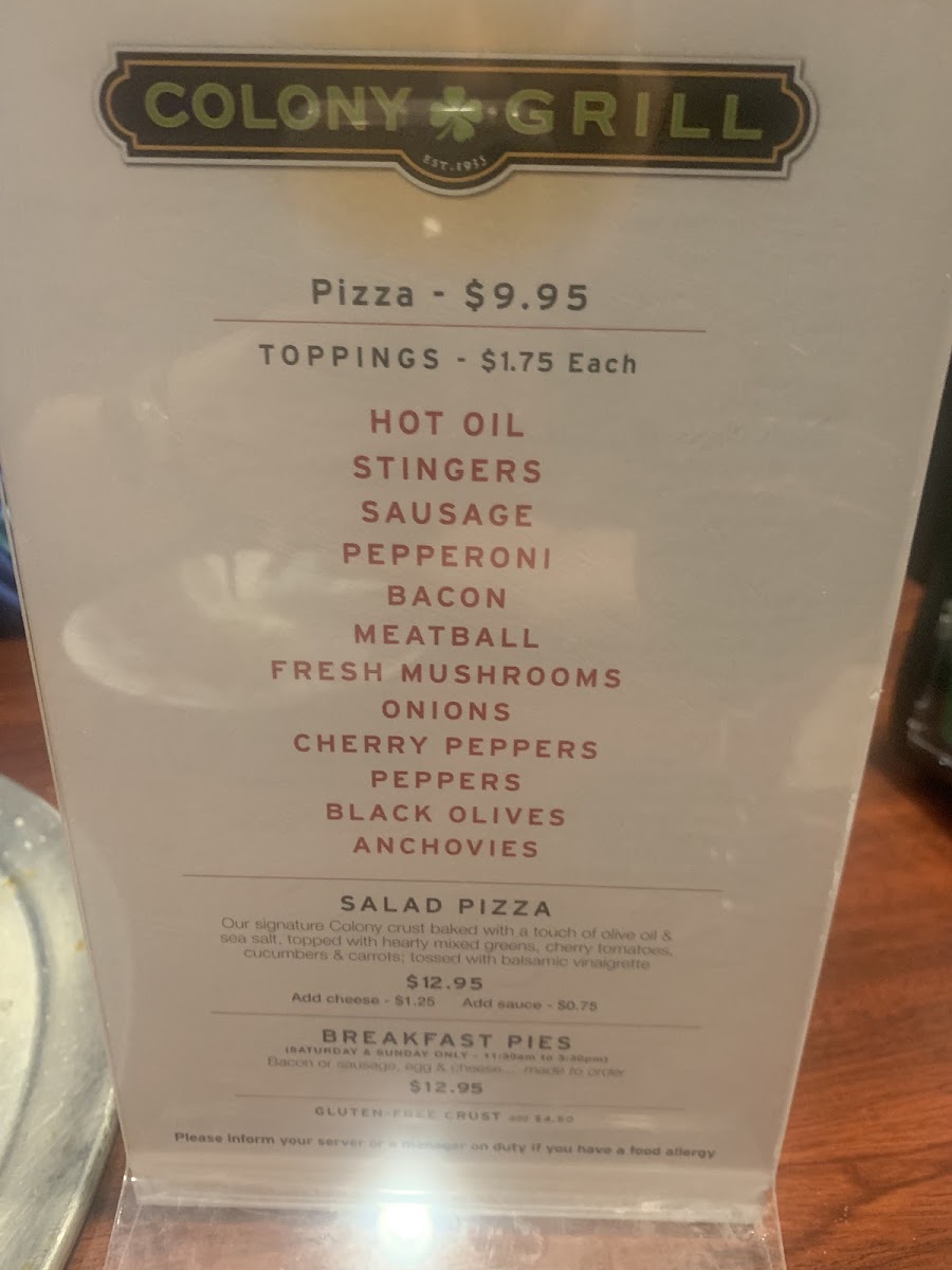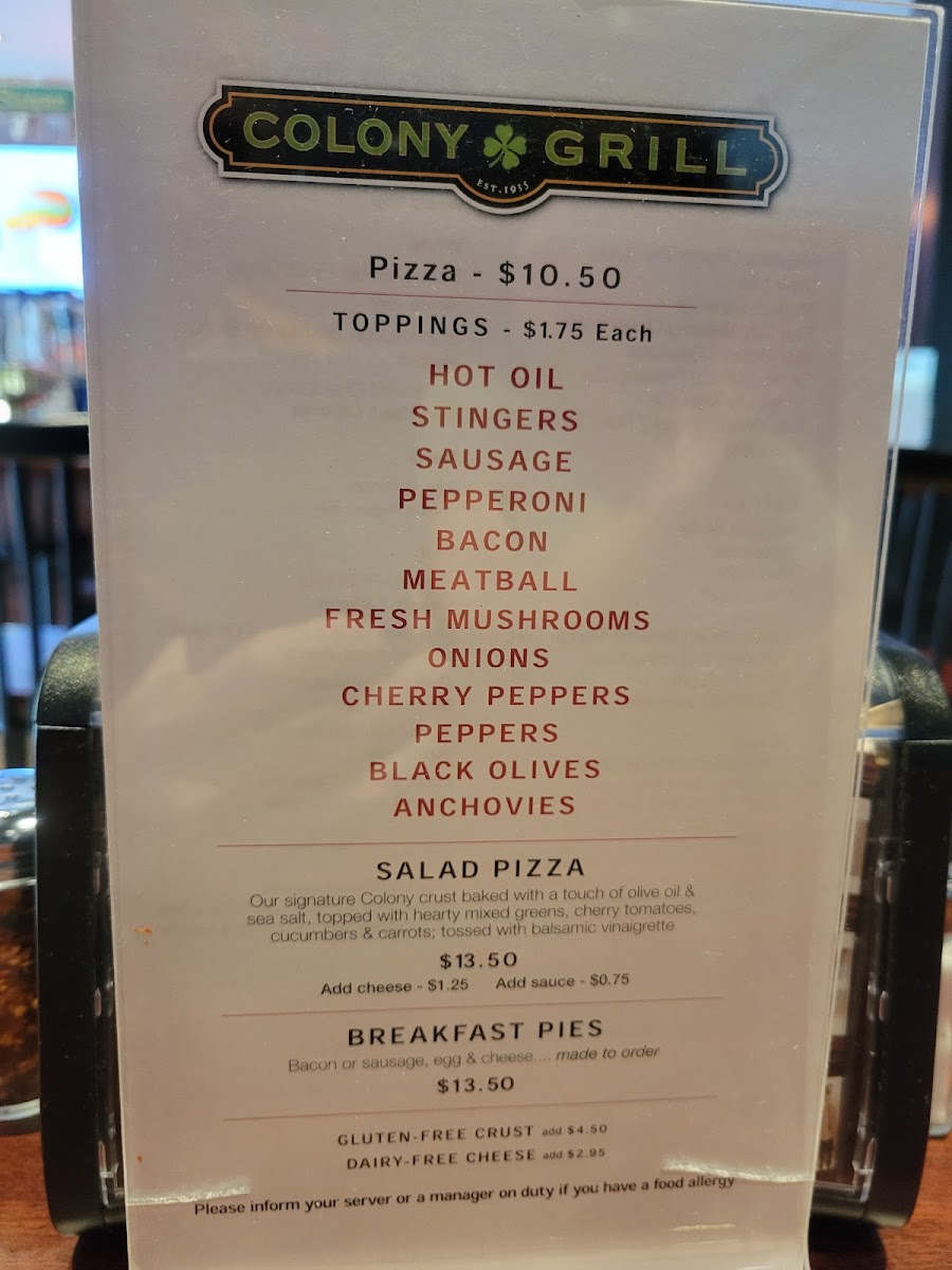 Welcome to Colony Grill, a delightful culinary gem nestled in the heart of Arlington, VA, at 2800 Clarendon Blvd. If you are on the hunt for a pizza experience unlike any other, you've come to the right place.